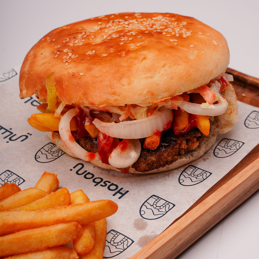 Beef patty with coleslaw, Ketchup, Mustard, Pickles & Fries